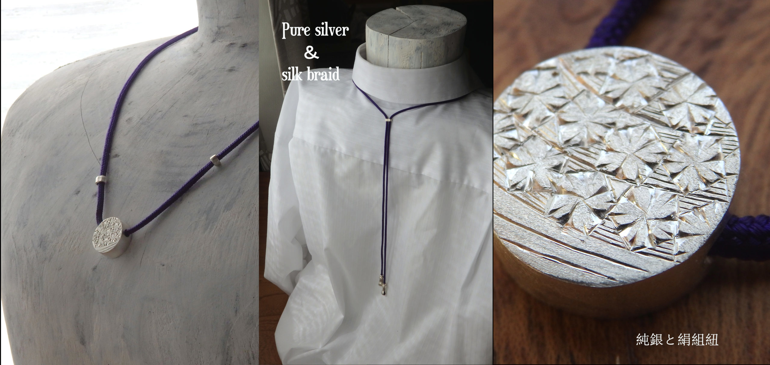 オーダーメイドで注文を受け、一つ一つを手作業による個人製作で運営しています。使用する素材は、純銀[silver950]銀。地金を叩いて形作る「鍛金」と、タガネを使い緻密な模様を彫り込む「洋彫り」を核とした伝統技法によって、手作業でしか生まれない強弱のある表情と温かさをアクセサリーに吹き込みます。 また、デザインはもちろん、作品を納めるジュエリーケースや細かな銀パーツに至るまで全て自作することで、他とは違う、オリジナルであることを大切にしています。