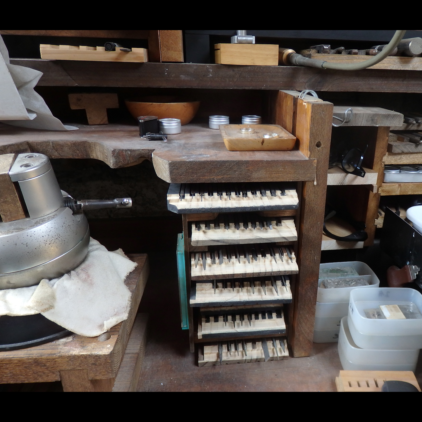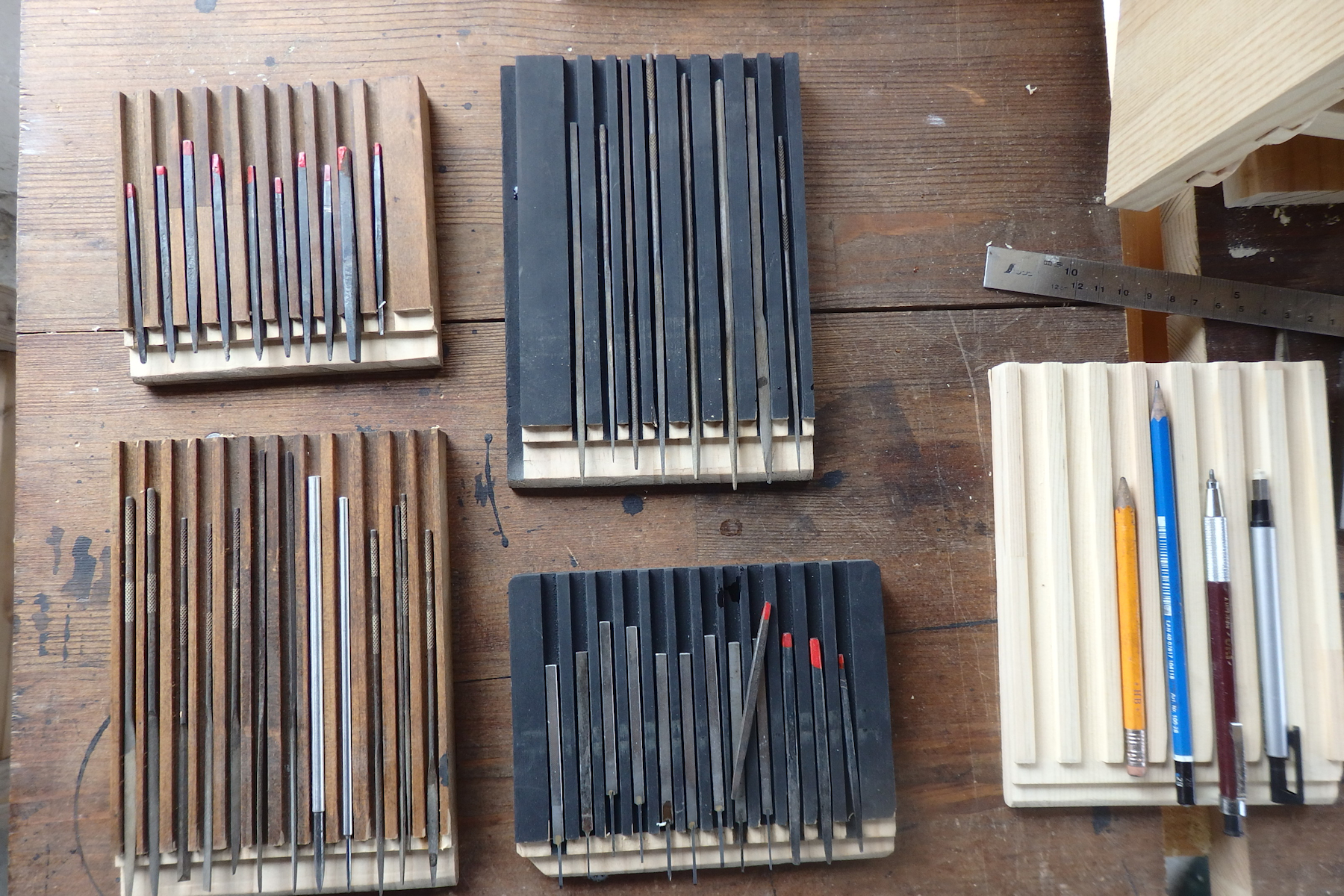作業効率をよくするために道具置きは重要です。特に道具が多い作業にすぐに探せる配置が必要です。私自身もタガネとヤスリの種類が増えてきて、毎度探すのに時間を取られますし、最悪なのは作業が中断してしまうことです。なのでタガネ置きとヤスリ置きに工夫をこらしました。