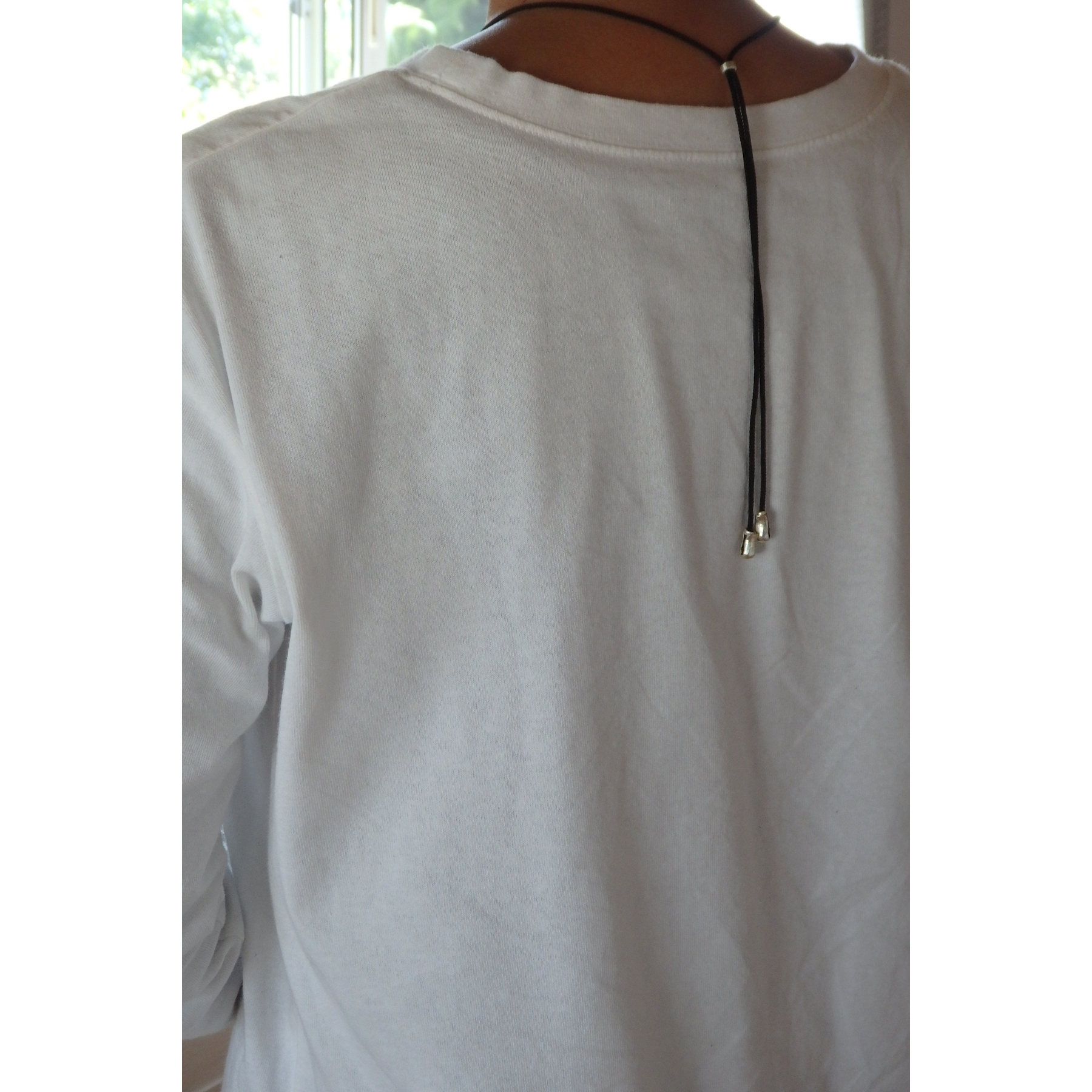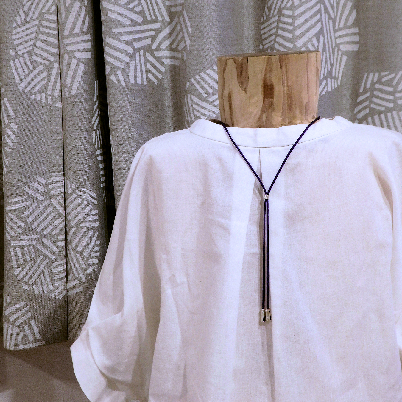 組紐の両端に取り付けた銀のエンドパーツ(キャップ)が、後ろに流した紐をピンと張ってくれるので、綺麗に見えます。胸前の長さ、後ろへ流す長さを調節できるので、自分に好みに身に着けることができます。