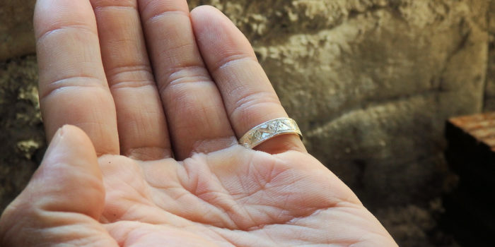 TOMO CRAFTの彫金の指輪は、連続した彫文様なので、小くサイズ直しをすることはできませんが、内側を削ることでサイズを1~2号程度広げることは可能です。
